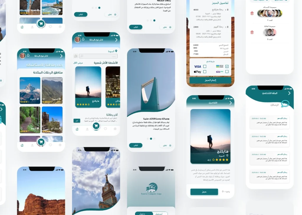 التطبيق يوفر للمستخدم إمكانية تصفح الوجهات، استكشاف الأنشطة، وحجز الرحلات بسهولة. التصميم اعتمد على مبدأ البساطة (Minimalism) مع توزيع متوازن للعناصر واهتمام بالتفاصيل الصغيرة مثل الأيقونات والـ Micro-interactions لتكون تجربة المستخدم مريحة وجذابة.
